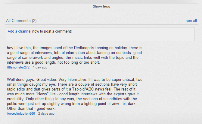 The feedback we recieved from people on YouTube was excellent and they both said that the documentary worked in different ways and we included some good information in our documentary the only real bad criticism we got was that of the vox popps and some of our cutaways.